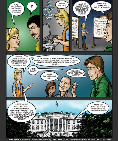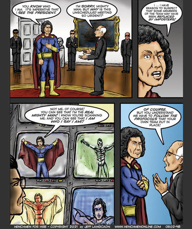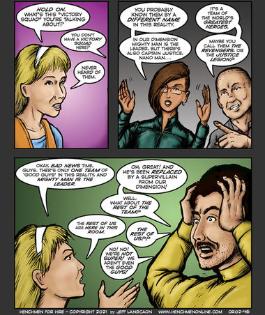 After I finished the first draft of this page it looked wrong to me for some reason, but I couldn’t figure out what was off. After a bit I realized that I had drawn the moustache on the wrong Henchman. I made the correction, but I’m still debating whether Tinker or Chance (or both or neither) is actually going to end up keeping the facial hair.