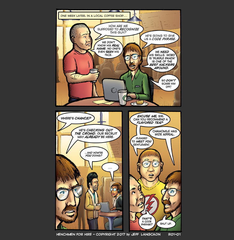 Also, if you’d rather read the current short story arc all at one time (and send some small support our way) you can click on the link in the upper right of the page and purchase the 99-cent PDF download of the Henchmen for Hire Special #1, which includes the two short stories The Recruit and The Rookie. You can be ahead of the game and meet the new recruit now!