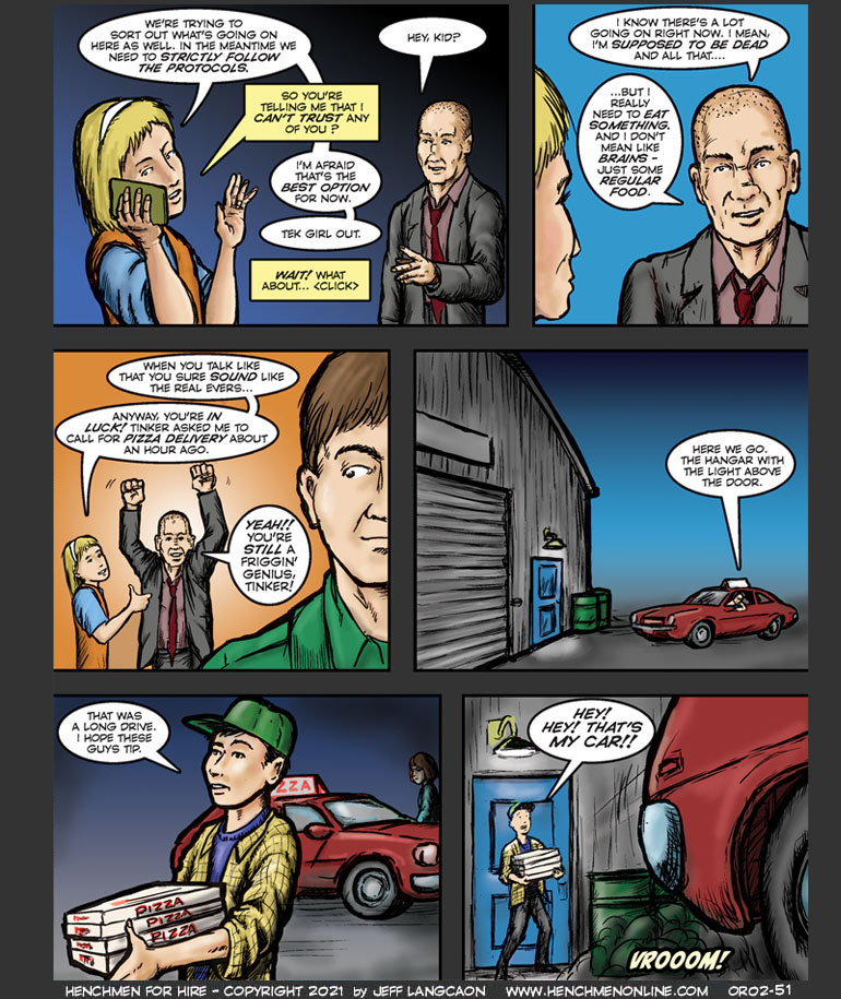 It’s not clear how much time has passed since the guys jumped between realities, but it’s probably been awhile between meals.  Fortunately, pizza seems to be pretty much the same from one reality to the next (so far).