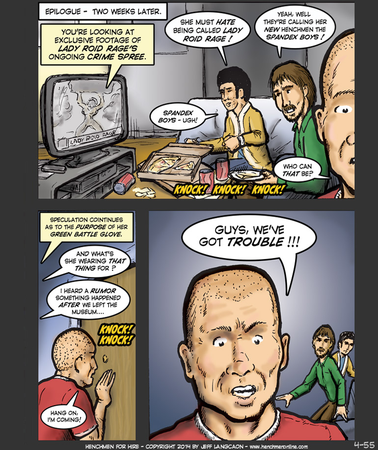 I’ve reached a milestone of sorts – this is the 300th posted page on the Henchmen for Hire site! Hooray! Thanks to all the readers out there who have been supporting and commenting and giving me feedback along the way.  The entire VIXX Saga, and now the whole “Rocked by Roid Rage” tale combined have gotten us to the big three-zero-zero!