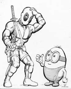 The first has Deadpool meeting up with a Minion, while the second one features Harley Quinn sitting in a rather unsafe location. They’ve both been drawn on 8 1/2 x 11 inch white card stock paper, and you can own one for the low price of $20.00 plus $5.00 shipping. If you’re outside the U.S., contact me if you’re interested in the art and I’ll calculate the shipping cost for you.
